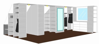 Het is geen probleem de kastindelingen van uw inloopkast aan te passen aan de schuinte, aangezien alles op maat wordt gemaakt. Zie ook voorbeeld 5 op deze site.