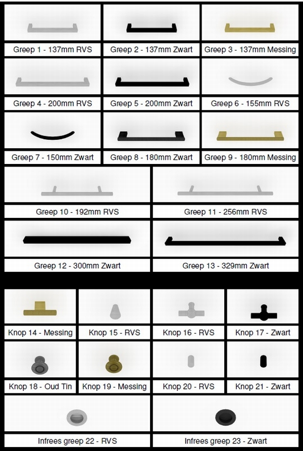 U kunt in onze showroom kiezen uit verschillende soorten grepen t.b.v. uw laden;