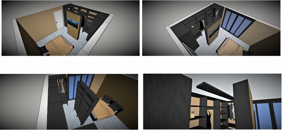 Zoals u ziet is het ook fraai de scheidingswand in het midden van de kamer te plaatsen; u kunt in dat geval uw inloopkast via twee doorgangen bereiken.